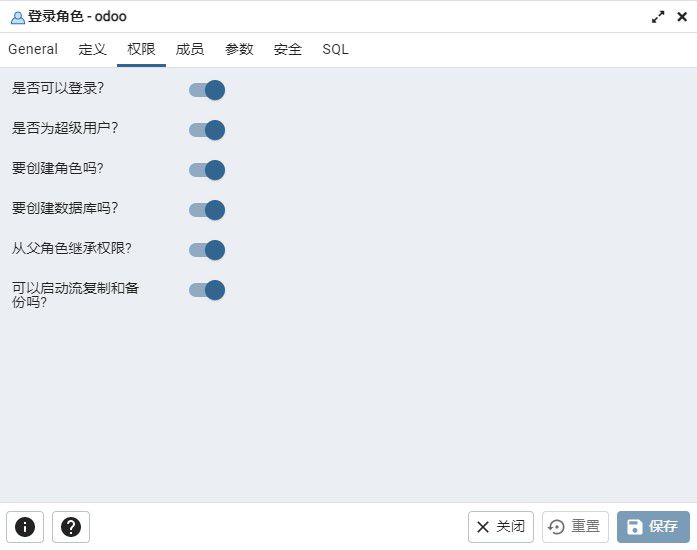 11、修改odoo15文件夹下面的debian里的odoo.conf配置数据库链接端口、用户名、密码。输入用户名是pgsql的用户名,输入密码是pgsql的密码。注意的地方是pgsql的用户名需要开放所有的权限。