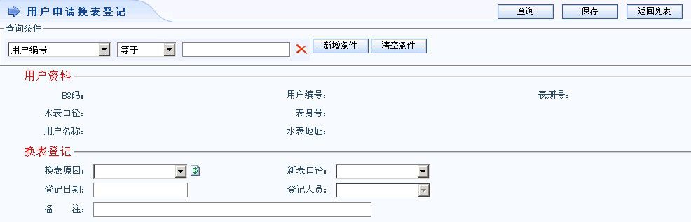 用户申请换表包括人为损坏后换表、丢失后补装表、水表迁移、用户要求更换。生成换表任务(换表原因的能够由且仅由管理员预先录入系统并能在后期通过表单选项设置)