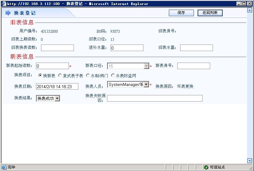 换表完成之后在系统登记所换新水表的起始读数以及旧表的终止读数,更新水表钢印号、型号、口径(如有调整)、保存之后系统会自动生成旧表尾数水费。
