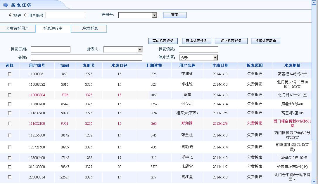 拆表业务流程:拆表任务生成->拆表工单打印->拆表完成录入工单并生成尾数水费,更新水表信息->装表->更新水表信息