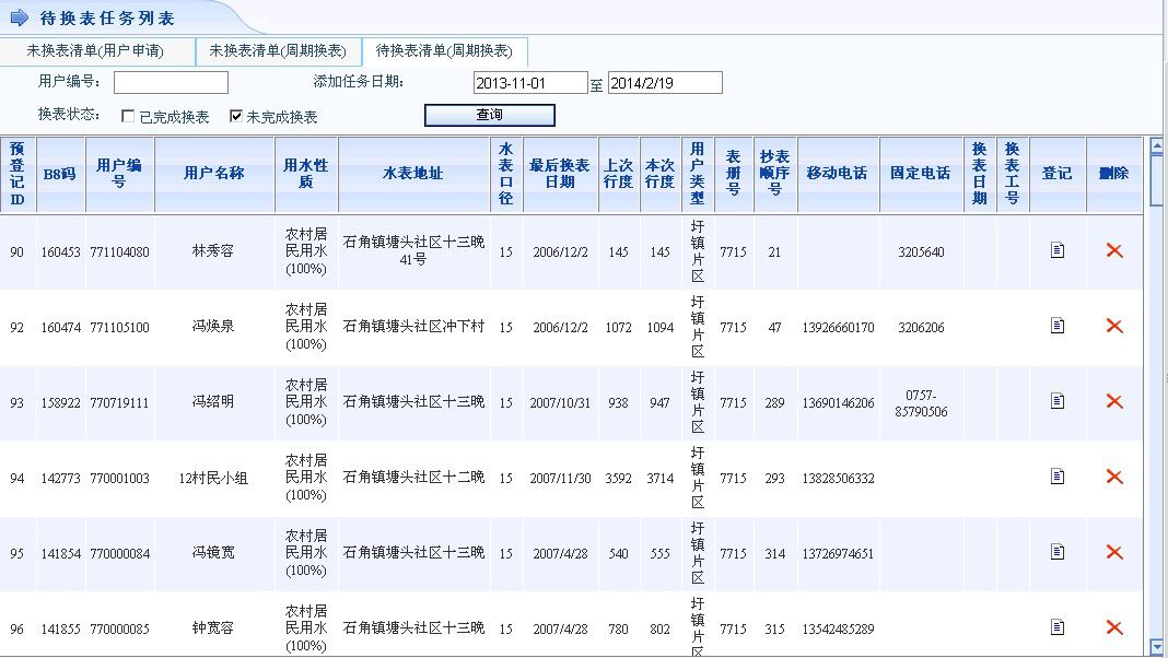 系统根据天津空港水务的周期更换规定,可自行增加换表条件,自动生成到期换表清单,并在清单中显示该水表的水费交纳情况(欠费金额)。清单内容能够随换表信息的更新而动态调整,即本次统计后仍没有更换的水表,下次仍需统计出来。