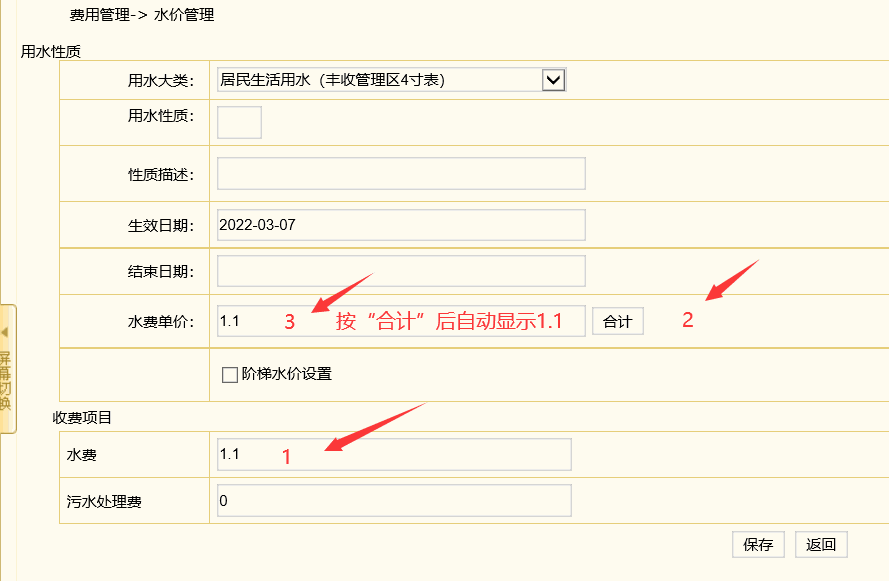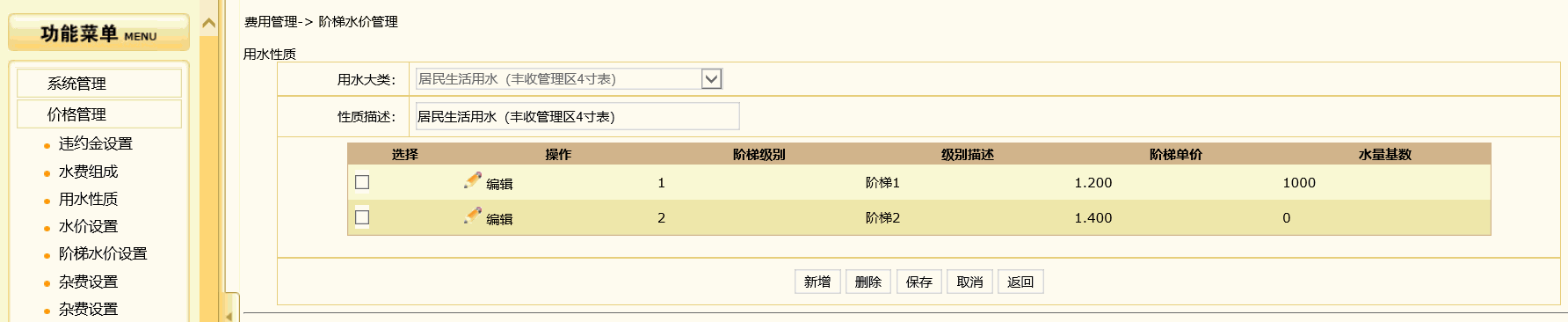 3.1编辑==》费用管理==》水价管理==》勾选阶梯设置==》出现阶梯水价管理页面==》新增