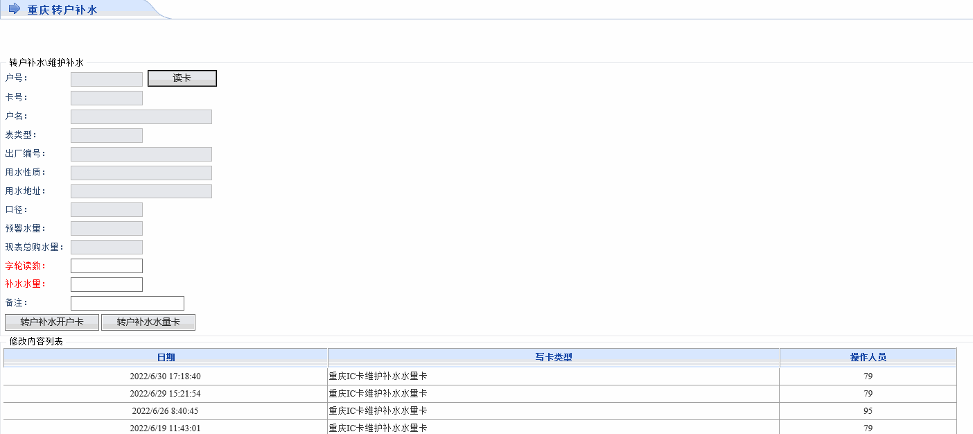 转户补水开户卡、转户补水水量卡。