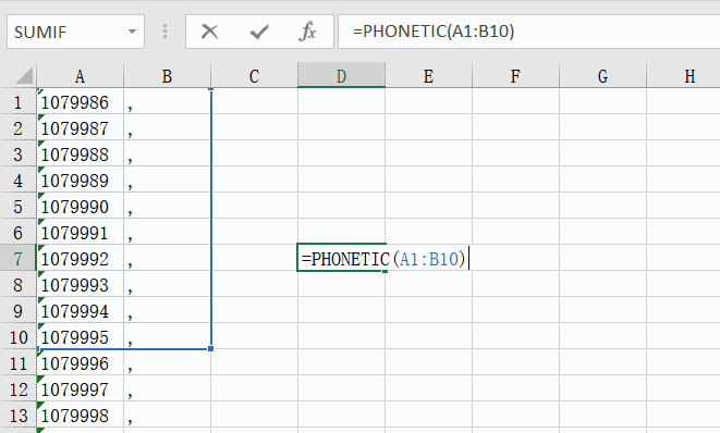 有一长串数据竖列提供过来,而你需要将这些数据全部拼接到一起并且加上分隔符号。传统的笨方法:逐个复制粘贴,并且加上分隔符;数据量少时尚可这样操作,数据量大了根本不可行,这时候就可以用到excelPHONETIC函数了。