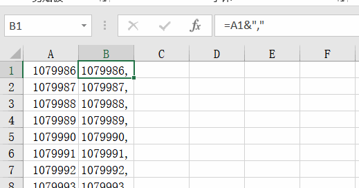 B列输入=A1&",",向下填充得到一整列“数据,”,