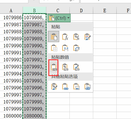 整列复制粘贴后选择“只值”,得到一整列“数据,”(可以复制到原位置或者其他位置)