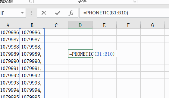 接下来像方法一一样使用PHONETIC函数即可得到拼接的数据,这次仅需要拼接带逗号的这列。