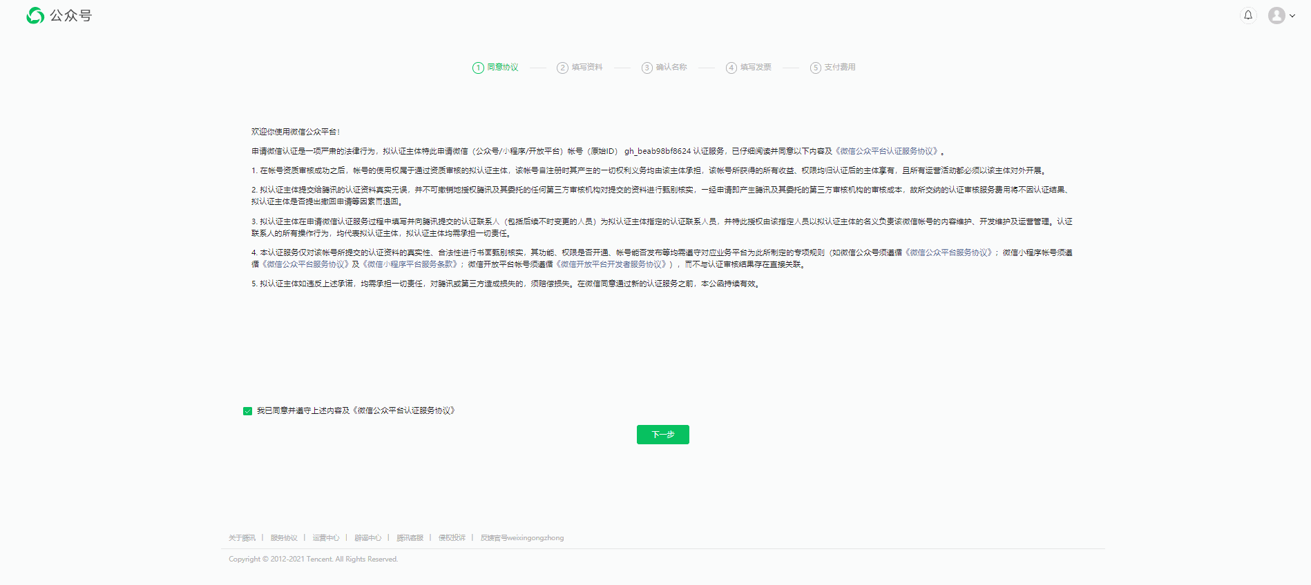 第二步:同意协议:签署《微信公众平台认证服务协议》