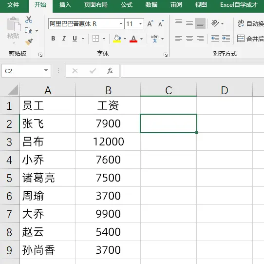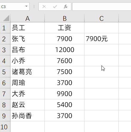 同样的,我们只需要在C2单元格中输入我们想要得到的结果,如7900元,然后C3单元格按CTRL+E就得到了所有的结果。