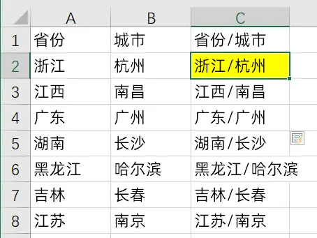 如下所示,左边是两列数据,我们需要两列数据合在一起,只需要给定输入一个结果,然后按Ctrl+E就能按照第一个样式,得到所有的结果
